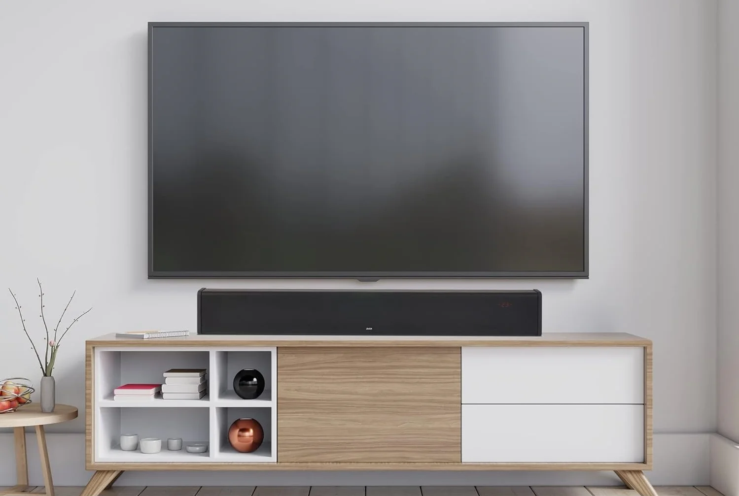 Works well with TVs from 50 “- 90”. Can be wall-mounted, placed upright on furniture, or placed “flat” on furniture. Room-filling 3D sound from a single aluminum cabinet. AccuVoice dialogue clarifying technology with six levels of voice boost. Dual built-in subwoofers produce great bass without external subwoofer. Works with your current remote control. Output Leveling tames loud commercials. Multiple inputs make it simple to add a multi-zone streaming audio receiver. Dimensions: 43.9″W x 3.3″D x 5.7″H