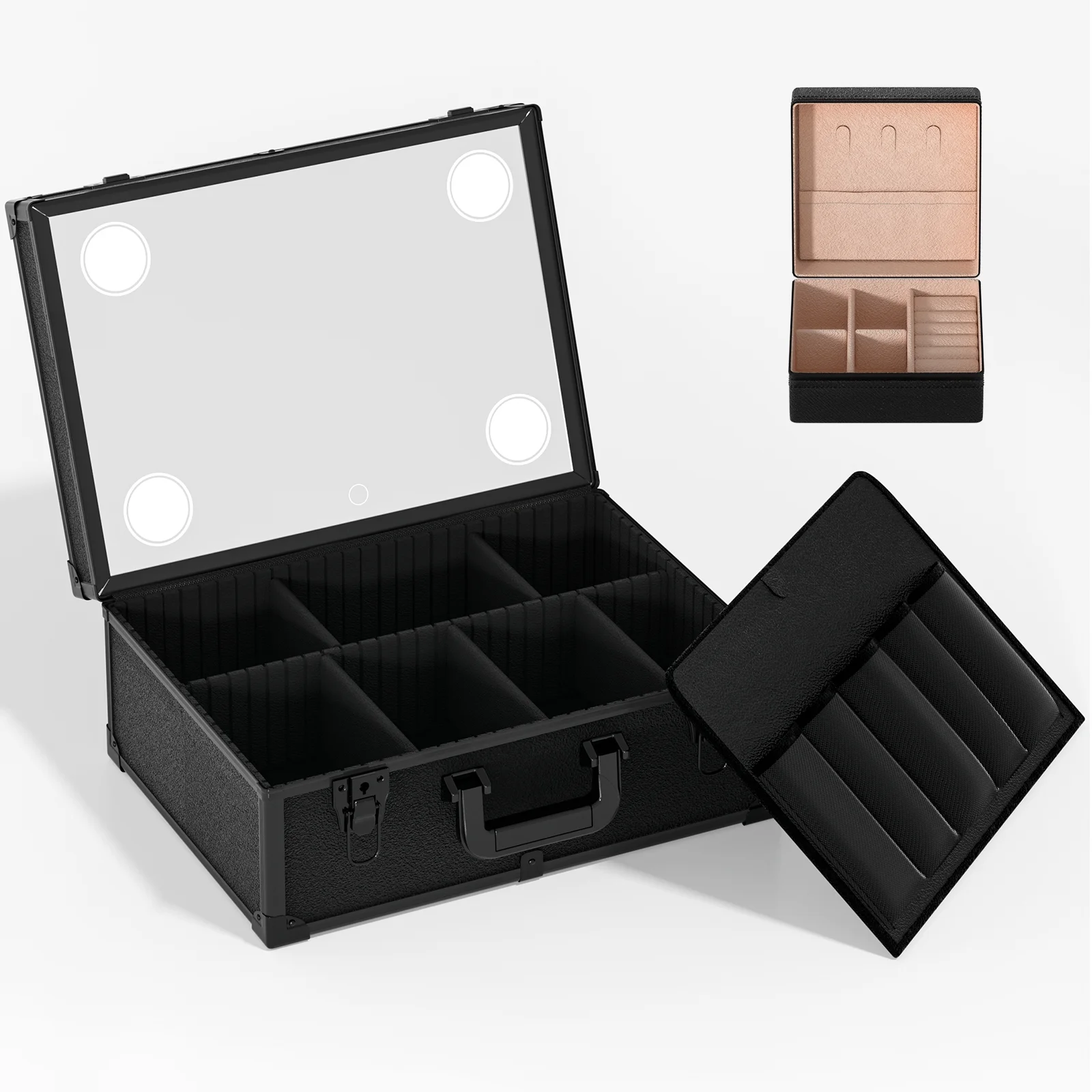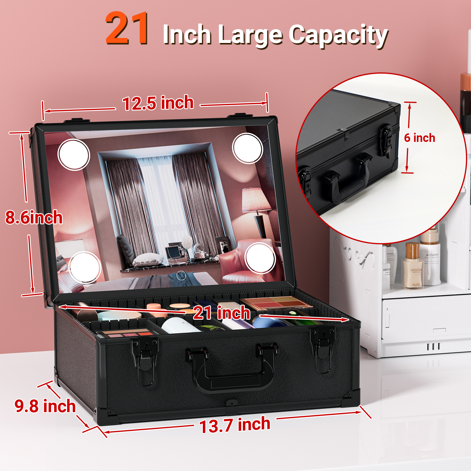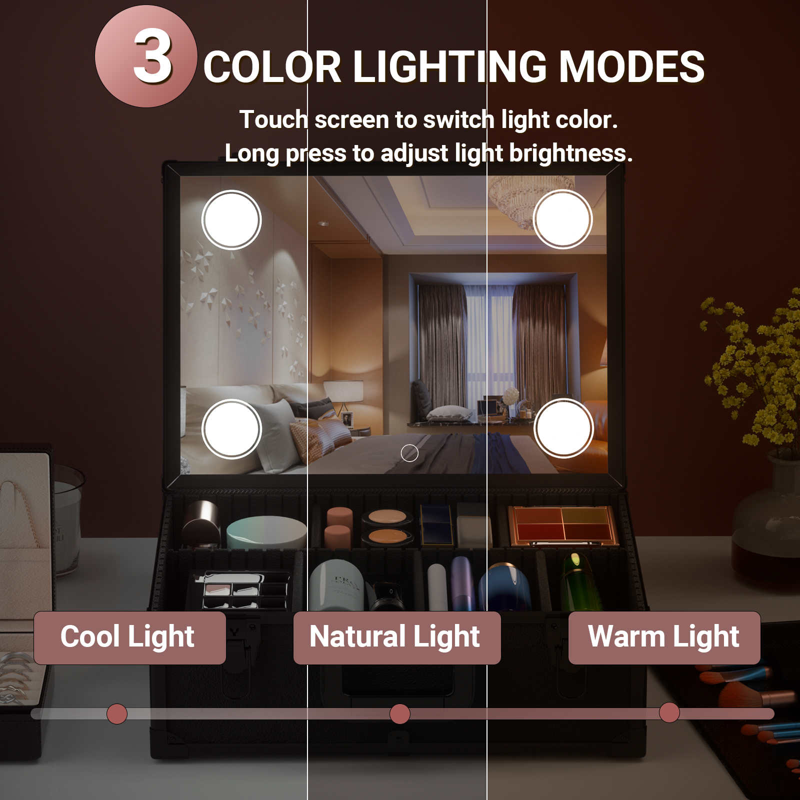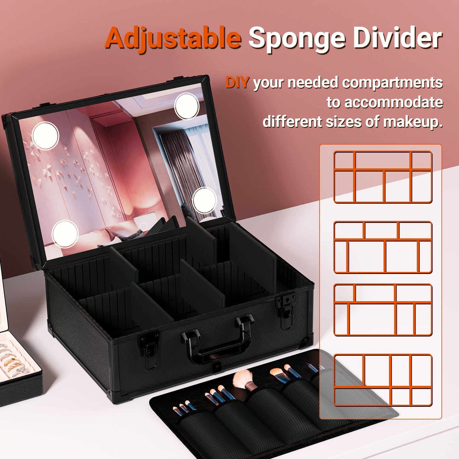 【The Best Choice As A Gift】Professional appearance and high practicality make this the best choice for her gift. 【Hold All Cosmetics】With a volume of 500 cubic inches, it can hold a large amount of cosmetics as well as makeup tools. 【3 Light Brightness Modes】Touch screen to switch light brightness, it can be used to adapt to different makeup scenes. 【Perfect For All Makeup Needs】This makeup train case comes with lights, makeup mirror, jewelry organizer and brushes board. 【Rechargeable, Full Charge for Running 8 hours】This cosmetic case comes with 1 USB slot and 1 USB charging cable. A full charge can keep it running for 8 hours. 【Cosmetic Guard】This makeup case can be locked with key, properly protect your valuable cosmetics and makeup tool. Once locked, it is not easy to be opened accidentally and will not make things scattered around. 【Adjustable Sponge Divider】Sponge dividers can be adjusted at will to store different sizes of cosmetics.