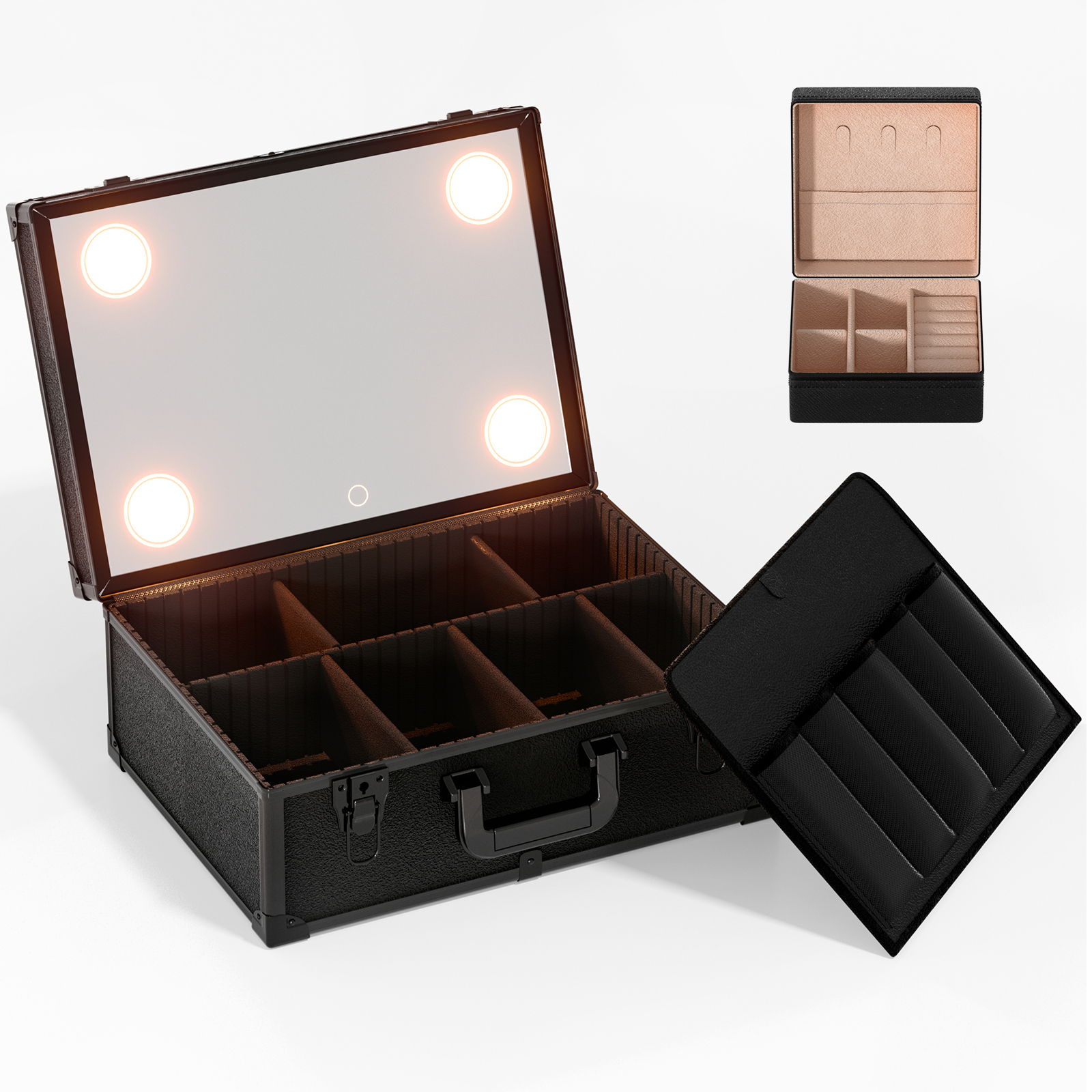 The best choice as a gift for her. Notice: Please charge the case before using. Specification: Brand: ZXMT – XHB Type: Makeup Case Makeup Case Size: 13.8 * 9.8 * 5.9 inch Jewelry Box Size: 5.7 * 3.9 * 3.1inch Light Count: 4 Led Lights Light Mode: 3000K ± 500K for evening skin care, 4500K ± 500K for morning makeup, 6500K ± 500K detailed skin care Number of Sponge Dividers: 5 Material: ABS Color: Black Features: 【Hold All Cosmetics】It can hold a large amount of cosmetics as well as makeup tools. 【Perfect For All Makeup Needs】This makeup train case comes with lights, makeup mirror, jewelry organizer and brushes board. 【The Best Choice As A Gift】Professional appearance and high practicality make this the best choice for her gift. 【Rechargeable, Full Charge for Running 8 hours】A full charge can keep it running for 8 hours. Package Includes: 1 x Makeup Case, 1 x Brush Storage, 1 x Jewelry Box, 1 x Key.