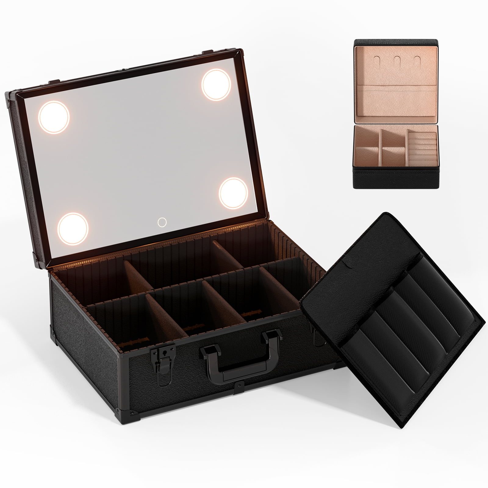 ZXMT Makeup Train Case with Mirror & Light & Jewelry Organizer Cosmetic Case Box with Brushes Board(Small Size, 4Lights)