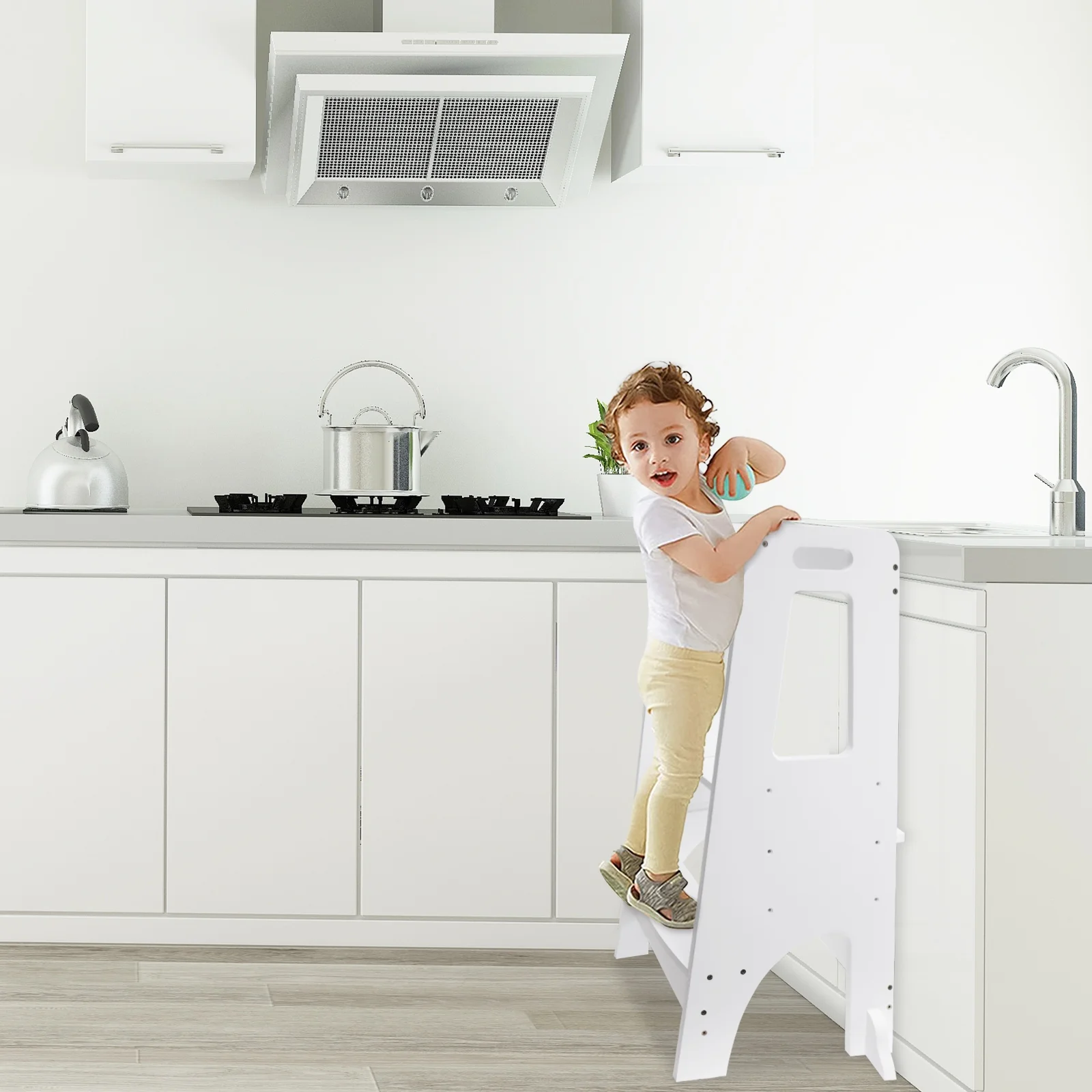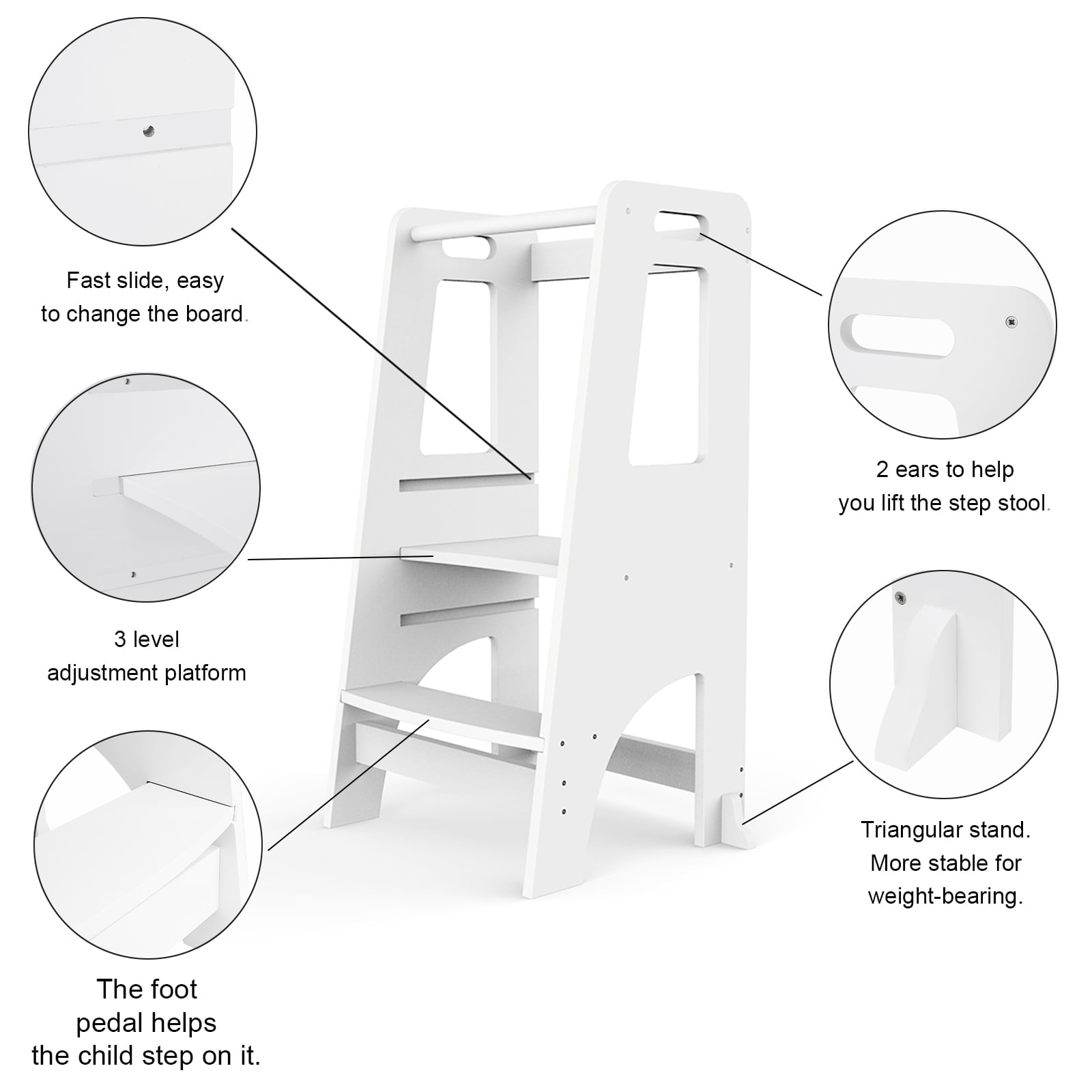 ZZBIQS Wooden Cooking Step Stool for Kids,Adjustable Height,Kids Step Ladder Stool Safety Bar Helper,White