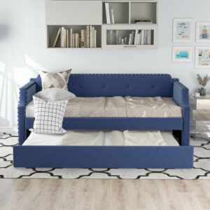 Euroco Twin Upholstered Daybed Linen Tufted Sofa Bed with Trundle, Solid Wood Frame for Bedroom, Blue