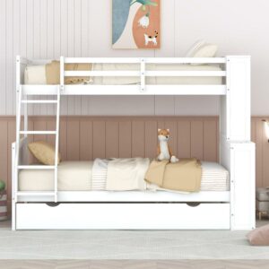 Euroco Pine Wood Twin over Twin Bunk Bed, Storage Bed with Cabinets and Shelves for Kids Teens, Sapce-Saving Design, White