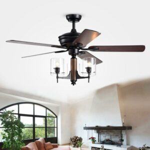Saranac 5-Blade 52-Inch Forged Black Lighted Ceiling Fans with Clear Pillar Glass Lamps (Remote Controlled)